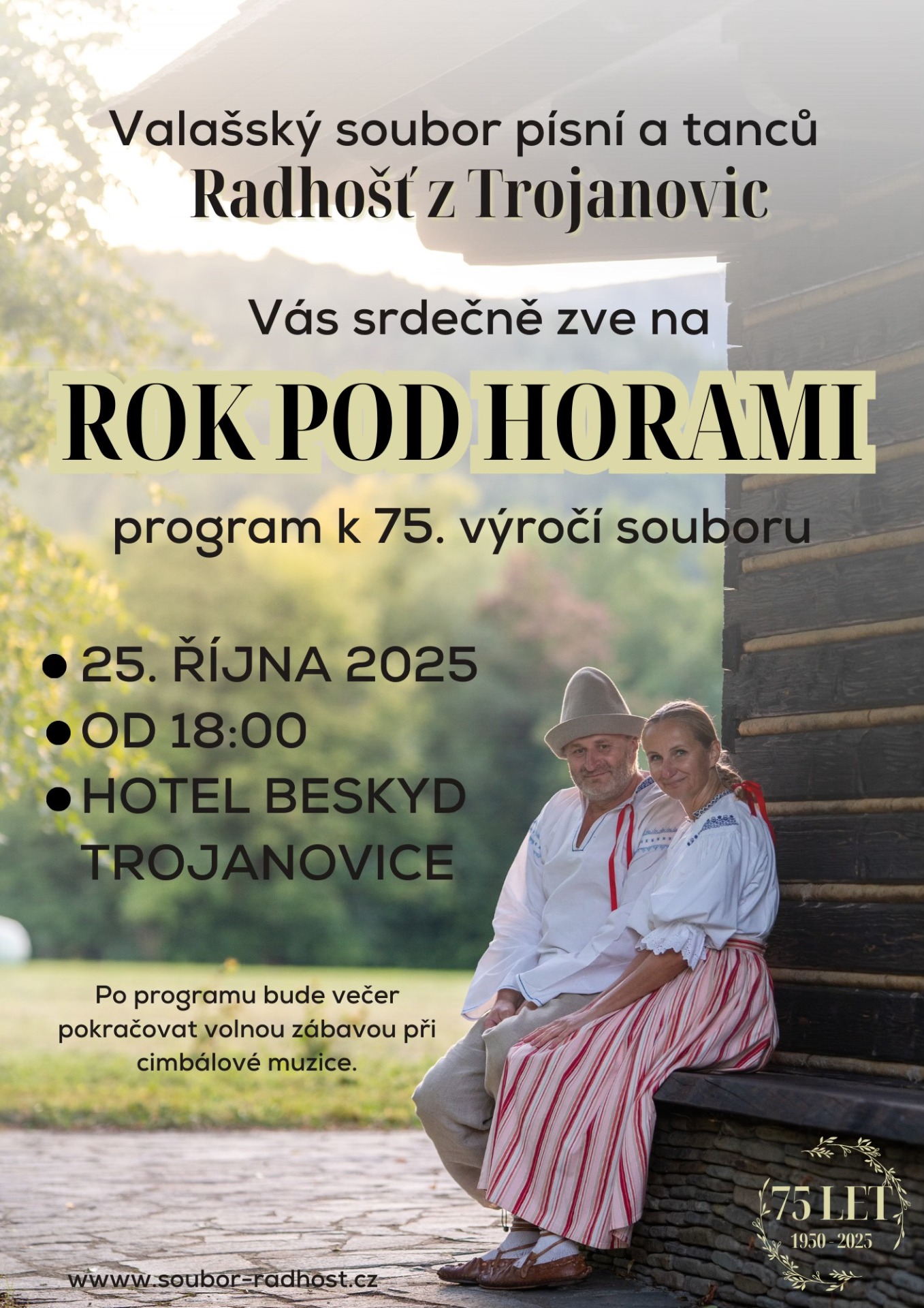 V sobotu 25. října jsme společně oslavili krásných 75 let našeho souboru Na jevišti jsme představili program Rok pod horami – příběh o tom, jak se dřív na Valašsku žilo, jak se střídala roční období a s nimi i práce, radosti a tradice našich předků.Děkujeme všem divákům a hostům, kteří s námi přišli tento významný milník oslavit. Dvě hodiny jste s námi seděli, ani nedutali, a nakonec nás odměnili potleskem, který nám ještě dlouho zní v uších.